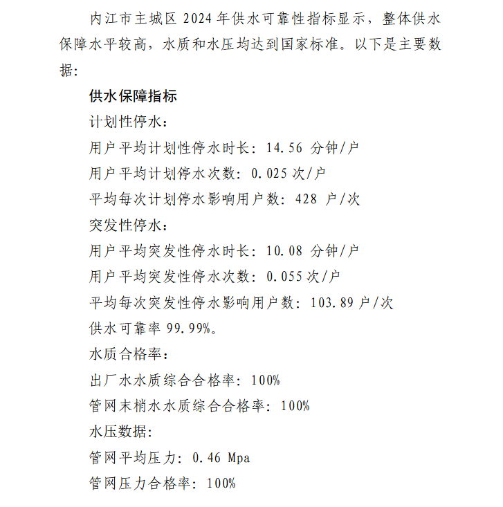 內江市水務有限責任公司供水可靠性保障指標數據公示